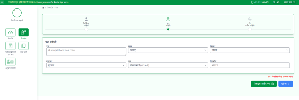 सर्व माहिती काळजीपूर्वक भरल्यानंतर Save / Update Profile वर क्लिक करा. एकदा प्रोफाइल पूर्ण (100%) झाली की तुमचे खाते सक्रिय होईल आणि तुम्ही थेट विविध कृषी योजनांसाठी अर्ज करू शकाल — जसे की ठिबक सिंचन योजना, शेततळे अस्तरीकरण, बांबू लागवड, मधुमक्षिका पालन, हवामान अनुकूल शेती तंत्रज्ञान इत्यादी.